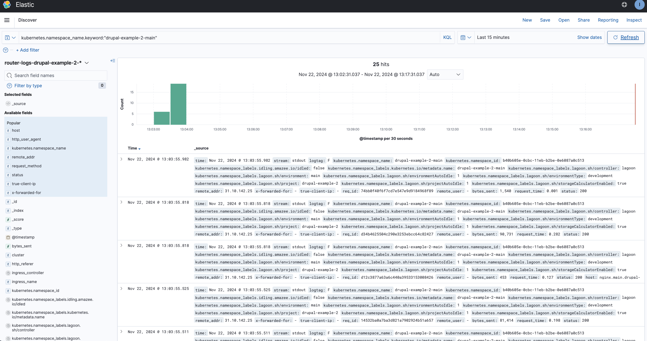 If you want to see specifically nginx logs, you can go to the search bar and enter kubernetes.container_name: "nginx"